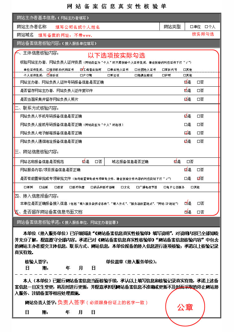網站備案核驗單填寫說明實例