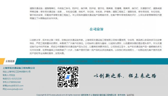 上海舉拓交通設(shè)施工程有限公司是一家集交通設(shè)施產(chǎn)品銷售、研發(fā)、設(shè)計(jì)以及道路、停車場(chǎng)工程、施工、維護(hù)、為一體綜合性上海交通設(shè)施工程有限公司,我們擁有優(yōu)秀的團(tuán)隊(duì),最具創(chuàng)新的意識(shí),先進(jìn)的設(shè)備以及最完善的服務(wù),確保產(chǎn)品以及工程質(zhì)量,嚴(yán)格依據(jù)ISO9001、ISO2000質(zhì)量管理體系來(lái)執(zhí)行。