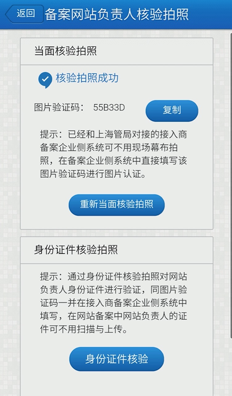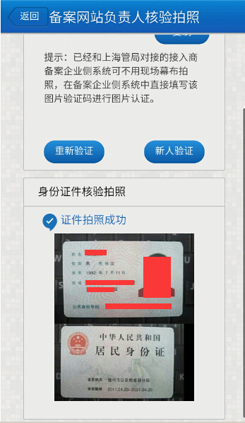 重新驗(yàn)證:如果您的核驗(yàn)拍照環(huán)境光線不清楚時(shí),可以選擇重新驗(yàn)證。點(diǎn)擊會(huì)重新進(jìn)入備案網(wǎng)站手機(jī)當(dāng)面核驗(yàn)拍照,驗(yàn)證成功將替換上次手機(jī)核驗(yàn)拍照圖片。